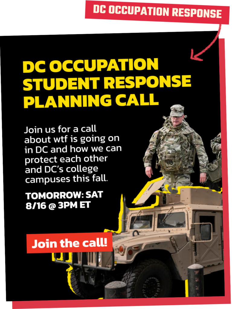 Aug 11, 2025 — When the Trump regime sent in ICE & the National Guard to occupy DC (and federalized DC’s police department), we held calls, trainings, and teach-ins for students to protect their rights, and organize against the occupation!